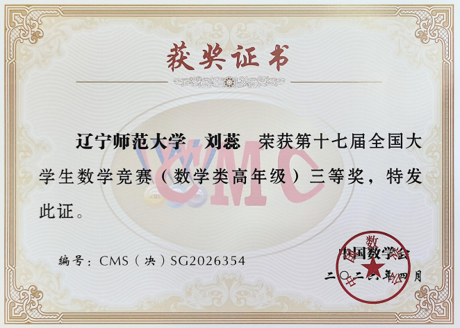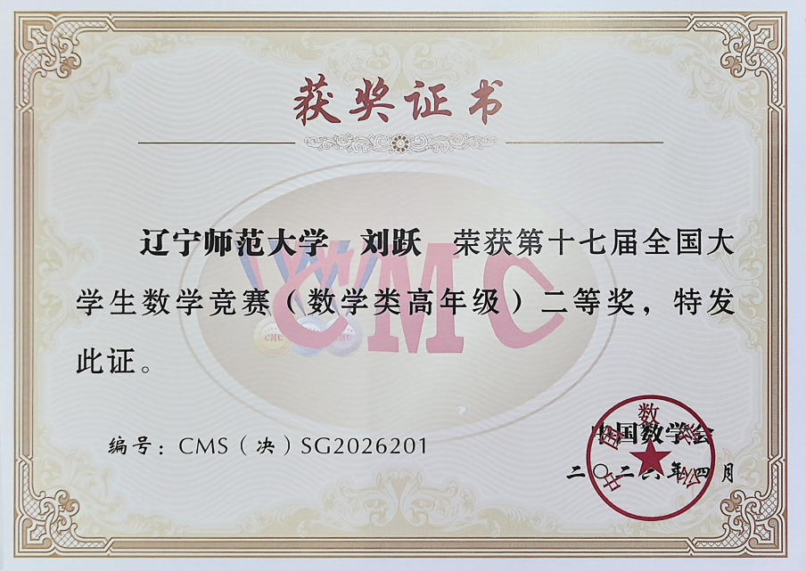 2023级数学与应用数学(师范)专业的刘跃和刘蕊两位同学代表辽宁赛区参加决赛,他们凭借扎实的专业功底与出色的综合能力,在赛事中脱颖而出,分别获得数学类高年级组二等奖和三等奖。其中,刘跃同学在决赛中表现突出,决赛成绩在辽宁省排名第二。